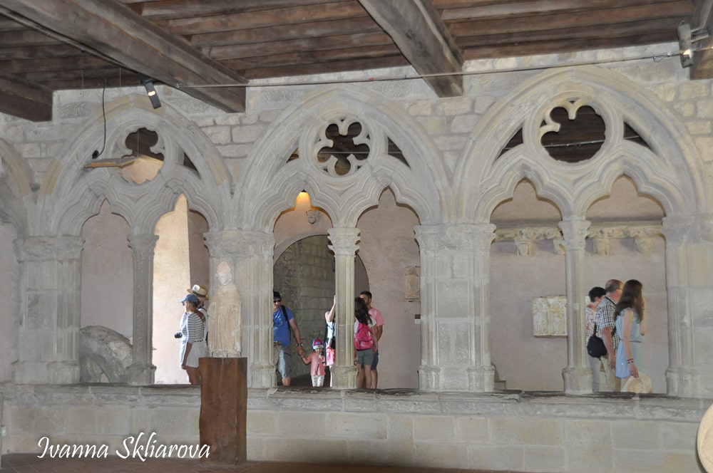 Дві вежі, що обрамляють в'їзд до замку, з'єднувалися навісною спорудою із склепінчастою аркою, навісні бійниці
