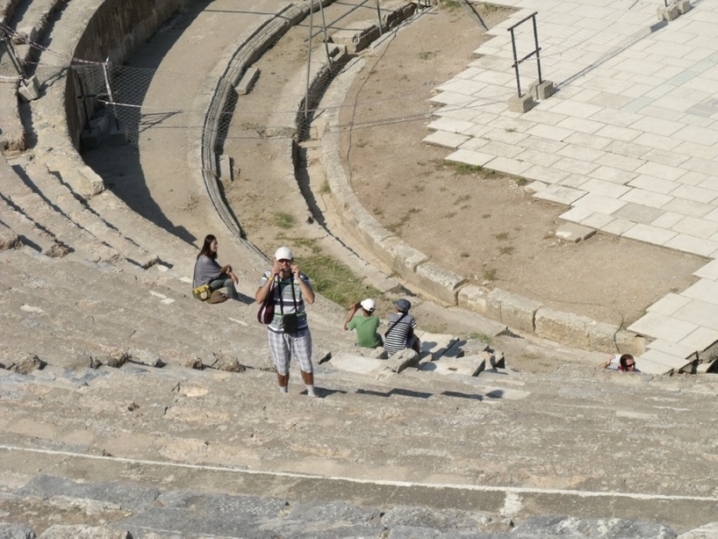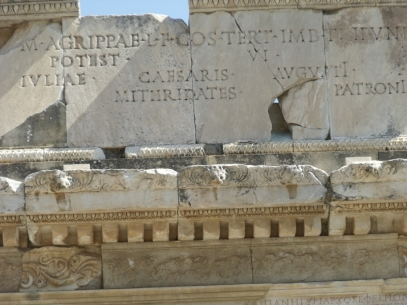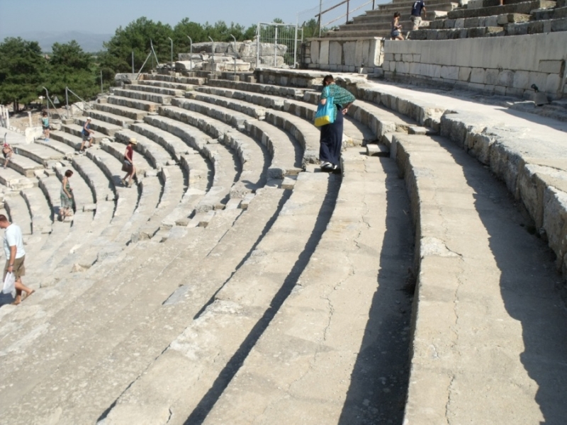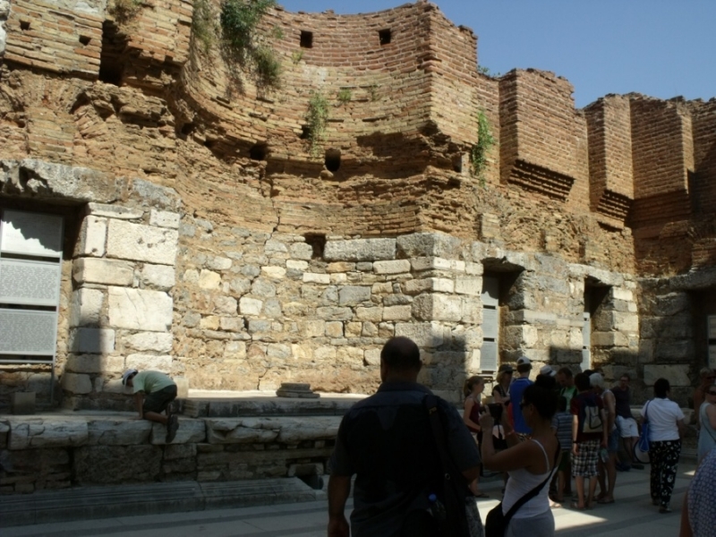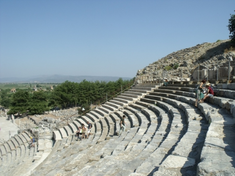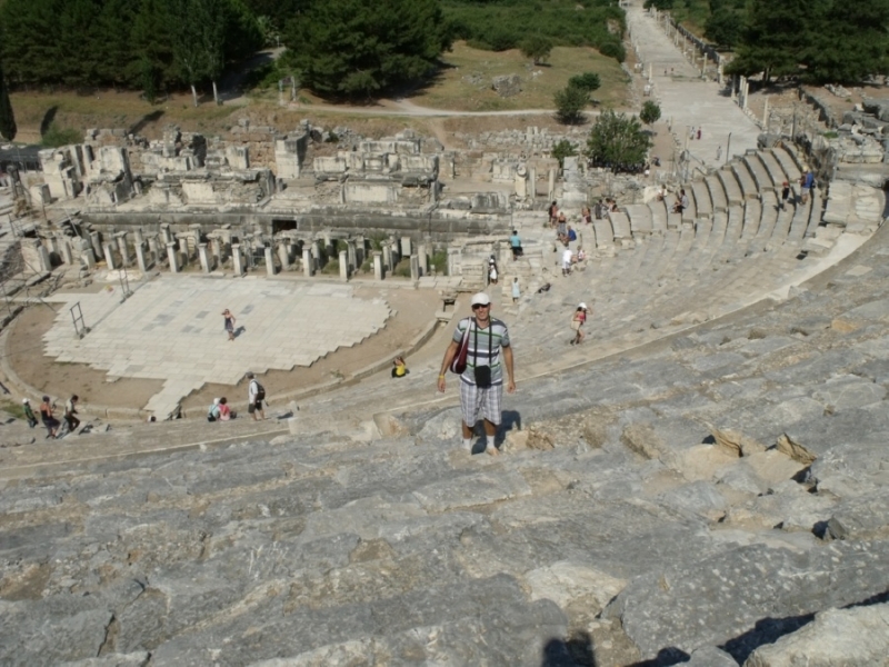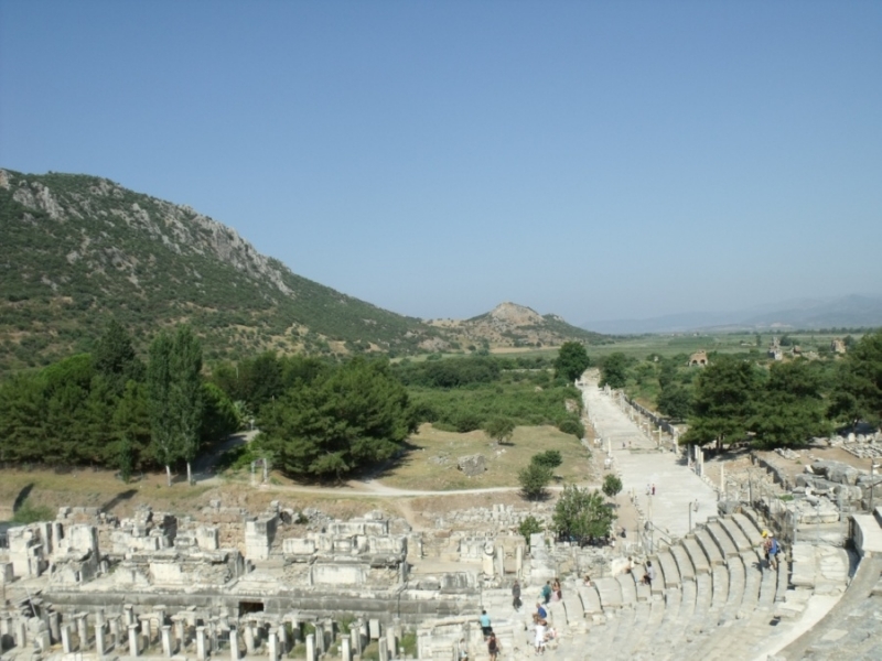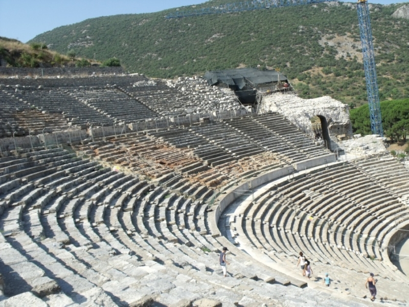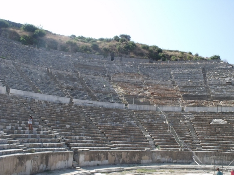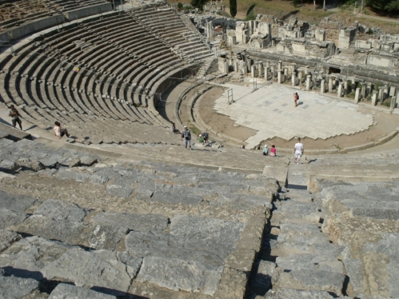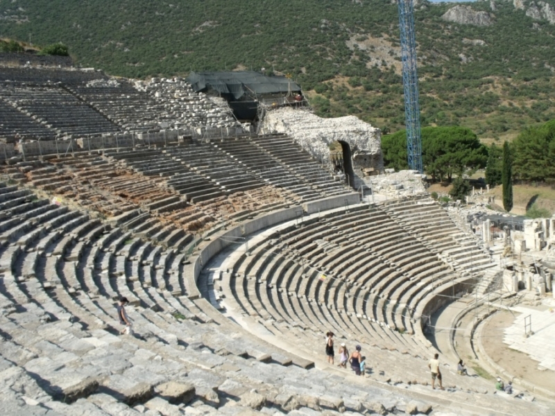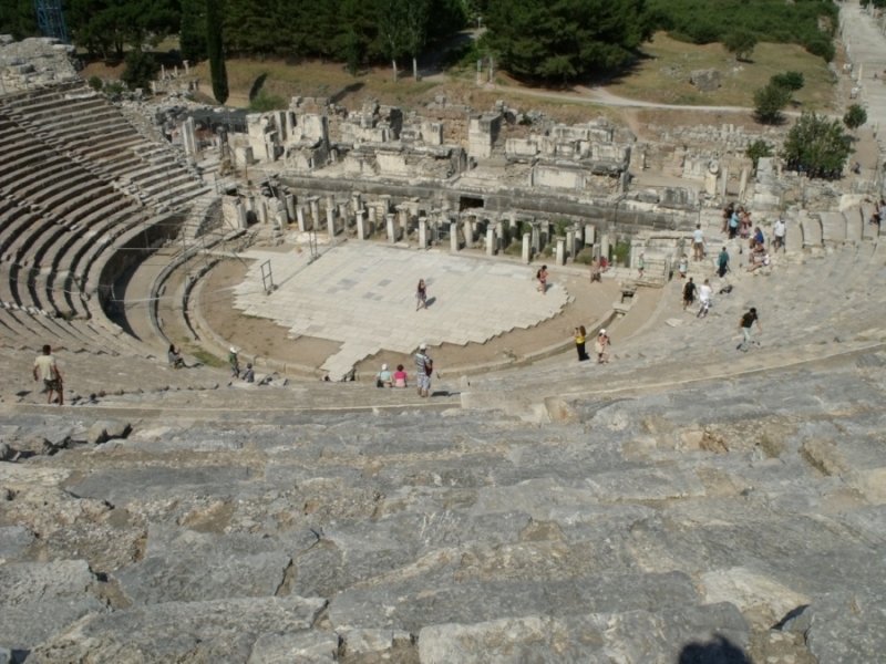 Від Бібліотеки Цельса направо через ворота Мазеуса і Митридата йде Мармуровий проспект до найвеличнішого спорудження Ефесу - Театру, в який одночасно поміщалося тридцять тисяч чоловік. У ньому давали театральні вистави і проводили гладіаторські бої. Театр був побудований в 117 році, але і сьогодні він являє собою грандіозну споруду. Складається з 68 зорових рядів, що сходяться в перспективі у фасаду триповерхової будівлі сцени, зверненої до спостерігача своєю тильною стороною. Сцена була прикрашена іонічними і корінфськими колонами, між якими розташовувалися скульптури богів і імператорів.