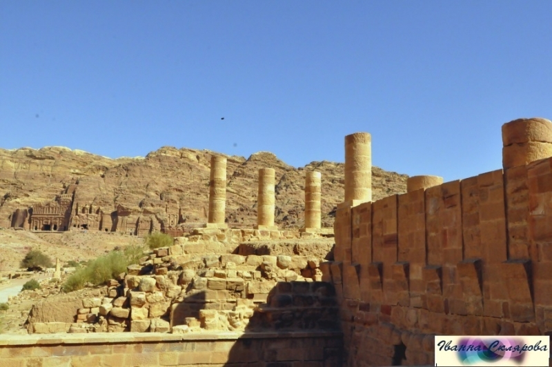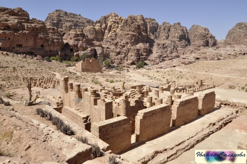 Територія Петри займає велику площу. Від центру, де добре збереглися руїни численних будинків, вже не скельних, а вибудуваних традиційним способом, з каменю, вона простягається на кілька кілометрів. Головна вулиця, що простягнулася зі сходу на захід через усе місто, була прокладена за часів римського панування. По обидва її боки тягнеться велична колонада. Західний кінець вулиці упирався в великий храм, а східний закінчувався трипролітною тріумфальною аркою. Ед-Дейр, вирубаний в скелі на вершині кручі монастир – величезний будинок шириною близько 50 м і висотою більше 45 м. Судячи з вирізаним на стінах хрестів, храм якийсь час служив християнською церквою, потрапити до якого можна лише піднявшись на 800 сходинок, звідки відкривається один з найкращих видів в Петрі.